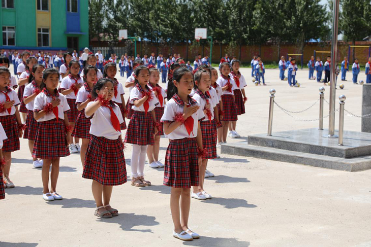 在嘹亮的《少年先鋒隊隊歌》中,少先隊員們為助學代表們佩戴了紅領巾。飄揚的紅領巾映紅了孩子們的笑臉,也照亮了助學代表們的心。