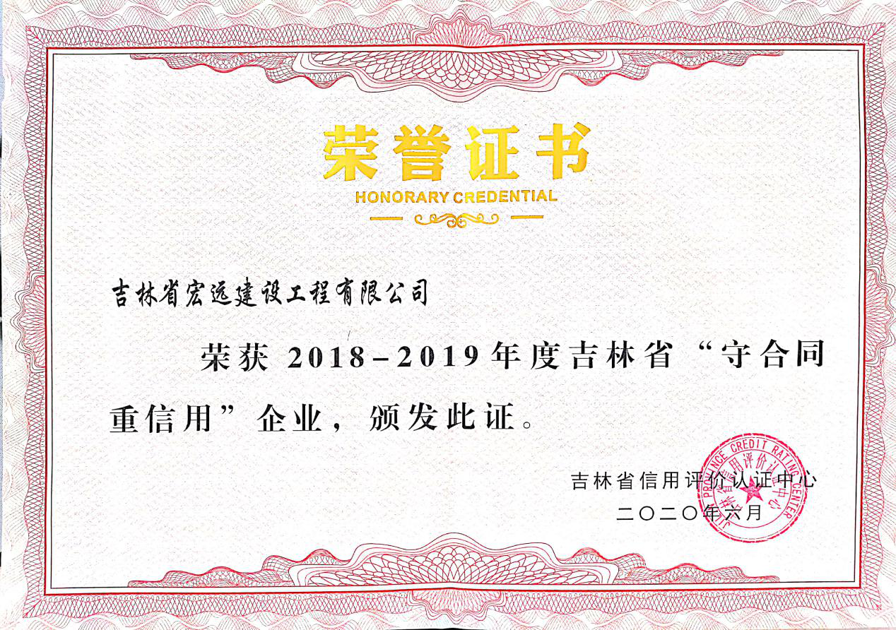 近日,吉林省宏遠(yuǎn)建設(shè)工程有限公司榮獲由吉林省企業(yè)合同信用協(xié)會和吉林省信用評價認(rèn)證中心聯(lián)合頒發(fā)的2018-2019年度吉林省“守合同 重信用”企業(yè)。