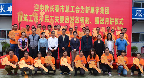 9月9日,長春市總工會領導蒞臨新星宇之洲上鄰項目為30對農民工夫妻發放了夫妻房的鑰匙,長春市總工會黨組書記、常務副主席甘琳、新星宇集團董事長張琪武、工會主席鄒鰆瑩、建安公司總經理王福章等領導出席了此次活動。