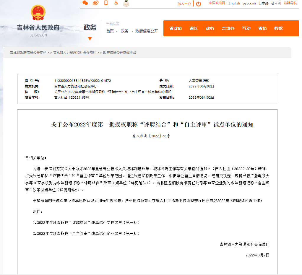 吉林省人力資源和社會保障廳于2022年6月2日發布吉人社函〔2022〕65號《關于公布2022年度第一批授權職稱“評聘結合”和“自主評審”試點單位的通知》公示如下。
